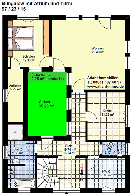 Atriumbungalow mit Turm 97 / 23 / 15 - konzipiert für sehr schmale Baugrundstücke! Wohnfläche 120 m² (3 oder 4 Zimmer) plus 15 m² offener Innengarten (Atrium)- zwei 3D-Videos